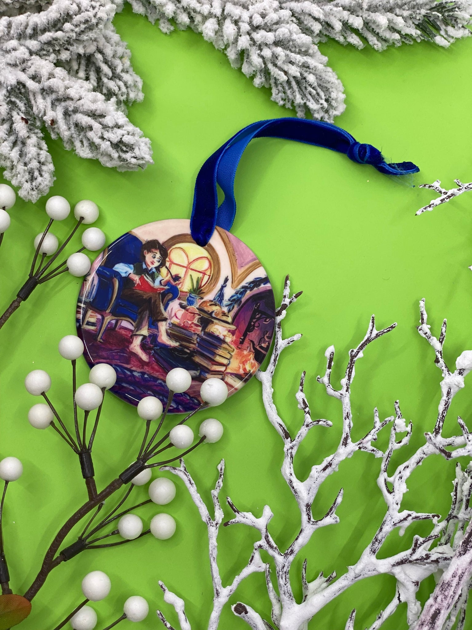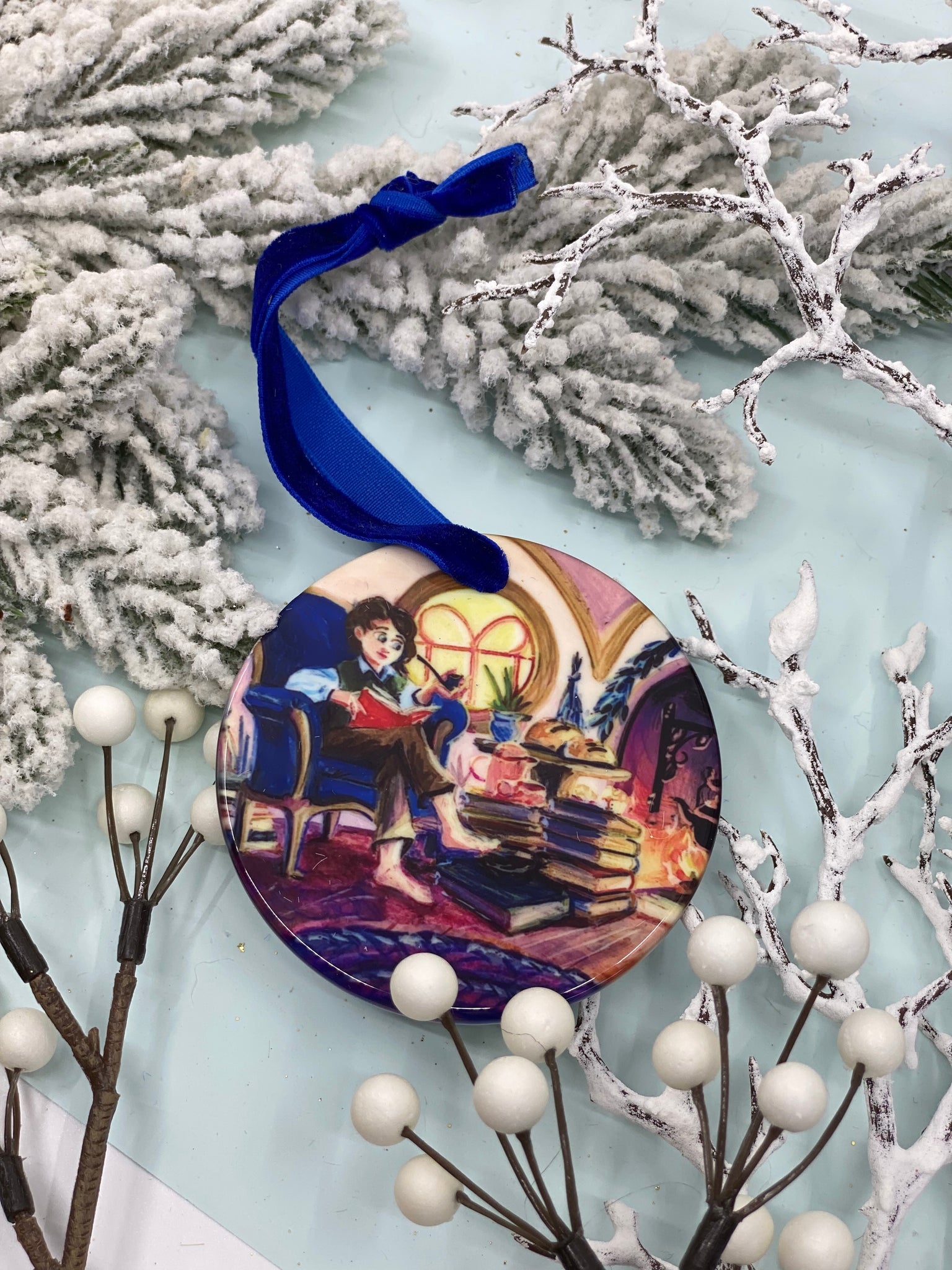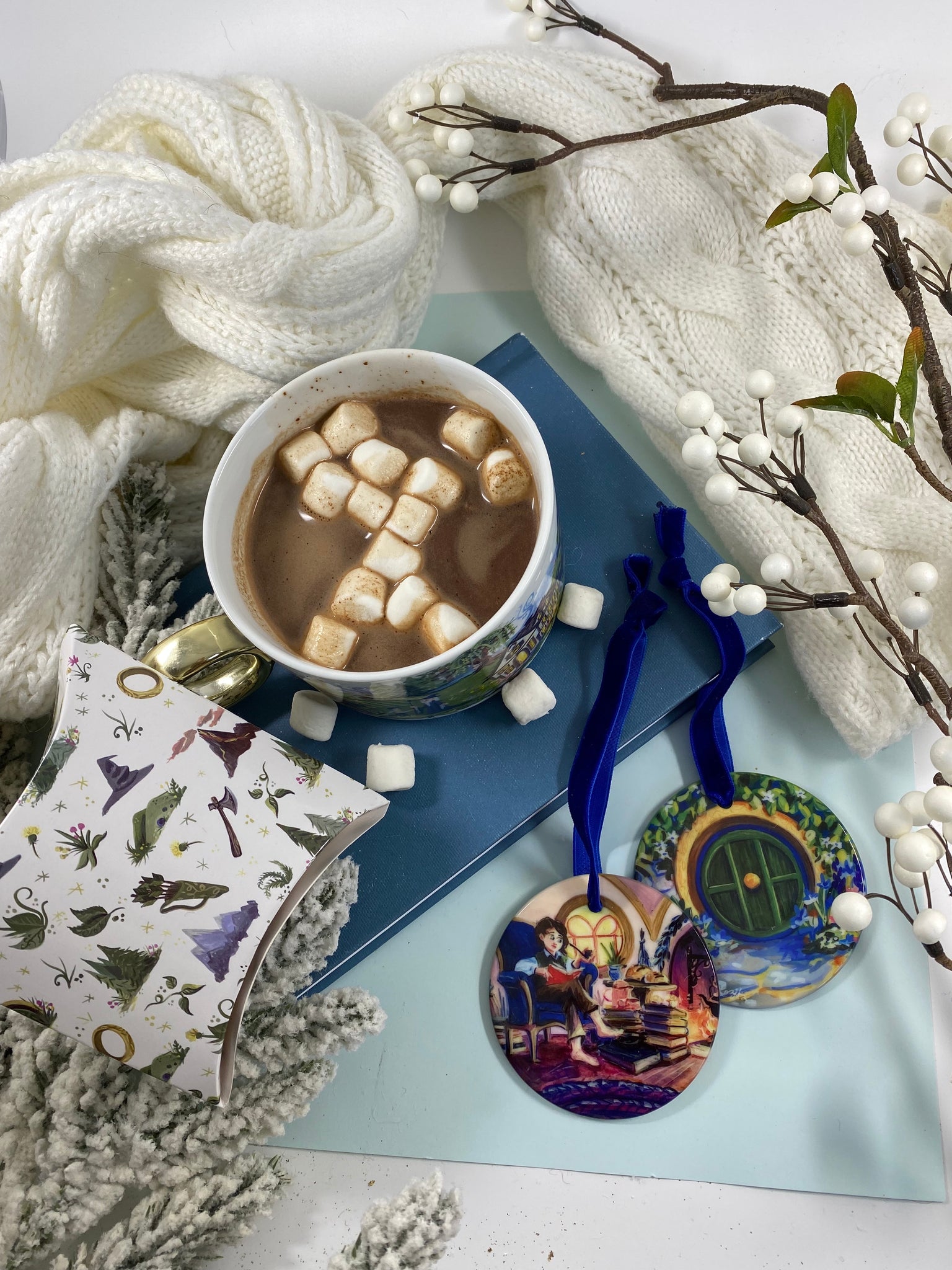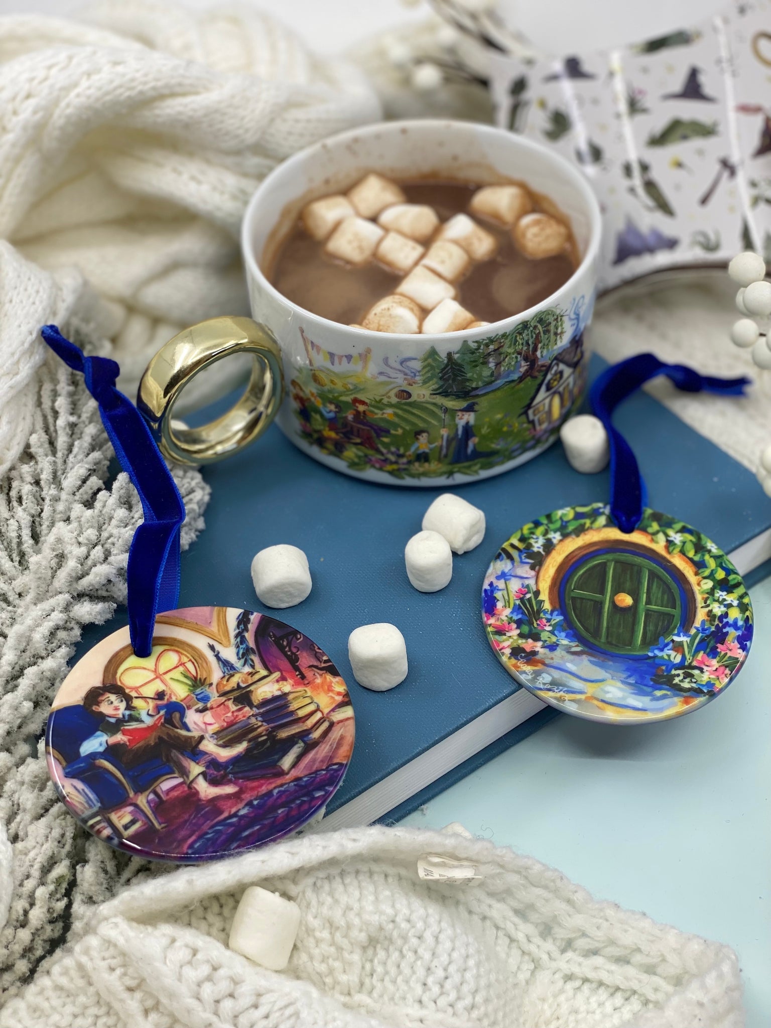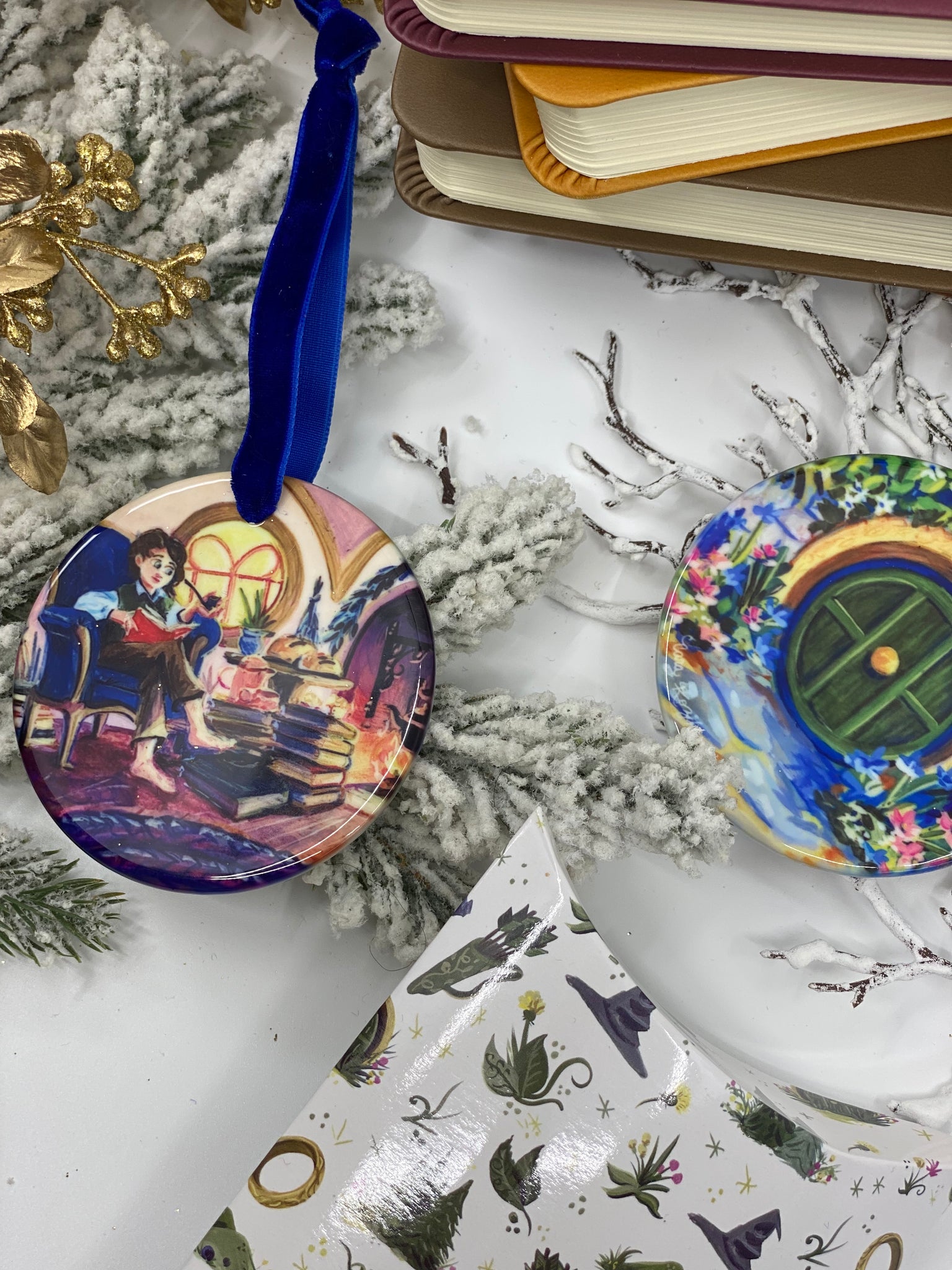 This holiday ornament features art work inspired by the Hobbit. The 3 inch diameter ceramic ornament with velvet hanging ribbon comes in a decorative pillow box to match the theme.